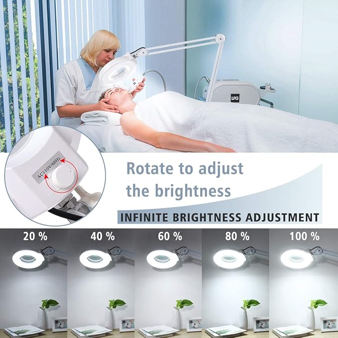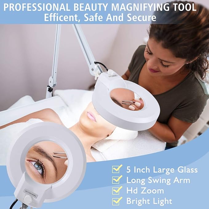 - Adjustable Floor & Clamp Lamp - Best rolling base has 5 wheels as it rolls easily across carpeting, floors, has the best stability. You also can attach it to your workbench as a clamp lamp, as long as your desktop have a plain exposed flat edge. You can place the glass lens where you need it by adjust the swivel arm, doesn't need a hand to hold it, free your both hands to work.
