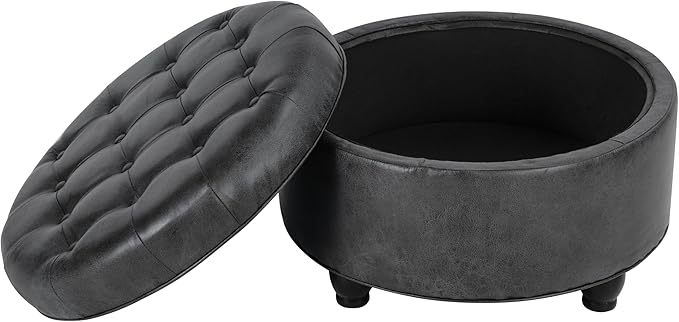 - STORAGE OTTOMAN: With rich Faux Leather upholstery our Round Ottoman with Storage can be used as a ottoman coffee table | Perfectly completed with tapered wood legs in a black ebony finish along with button tufting on top