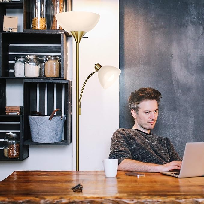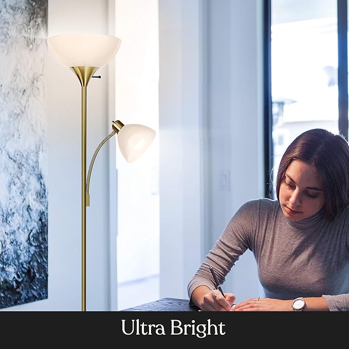 Brightech Sky Dome Plus LED Floor lamp, Torchiere Super Bright Floor Lamp with Reading Lamp for Living Rooms & Offices - Dimmable Tall Standing Lamp for Bedroom Reading - Gold Brass