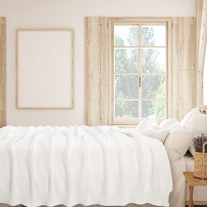 PiccoCasa 100% Cotton Knit Blanket Twin Size,Solid Lightweight Decorative Throws and Blankets,Soft Knitted Throw Blanket for Sofa Couch, White 60" x 78"