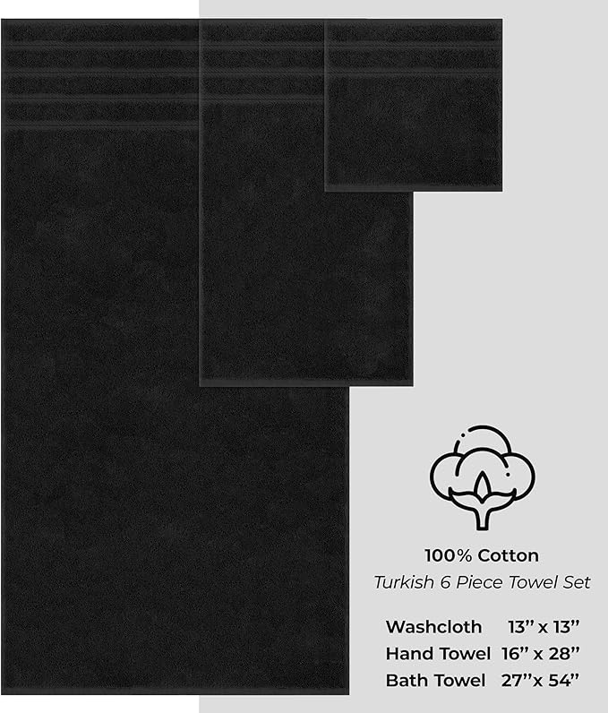 - ✅ Turkish Luxury 6 Piece Towel Set Includes 2 Bath Towels of 27 x 54 inches, 2 Hand Towels of 16 x 28 inches and 2 Washcloths of 13 x 13 inches.