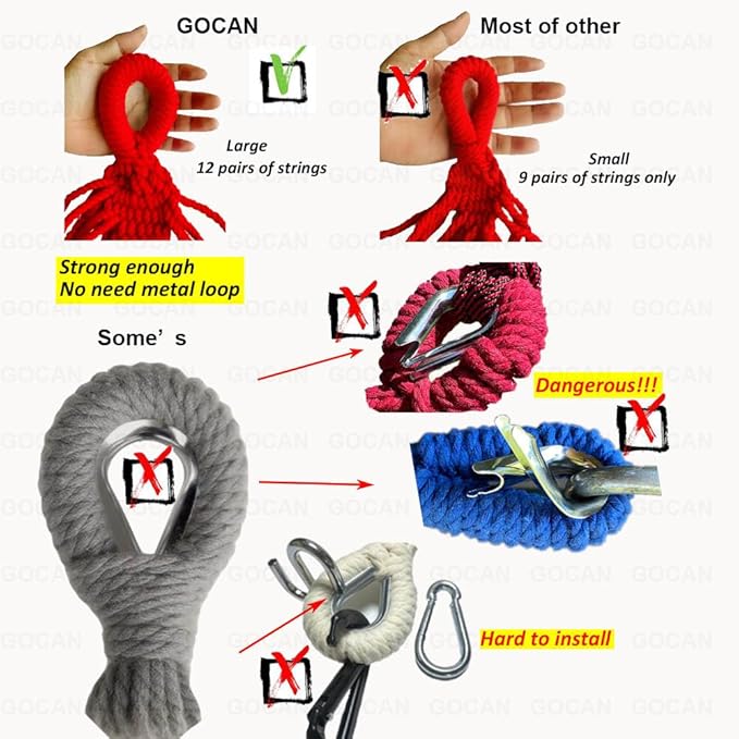 - 【3】Holds Up To 500 Lbs: The handcrafted knots at both ends and solid fabric are strong enough to holds up to 500 lbs. If you have metal S hook, don’t use it together with the metal ring of loop,Which will deform or destroy the metal ring.