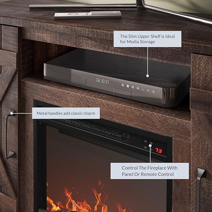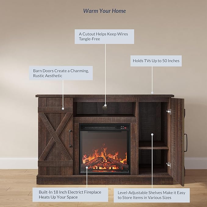 - [INFRARED HEATER] Make your home feel warm and inviting thanks to the integrated electric fireplace heater that showcases realistic glowing flames arising from faux smoldering wood.