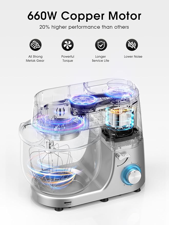 - Special Feature : Adjustable speed control, Tilt head Mixers, Smart chip controlled, Fully automatic electric stand mixer, 660W powerful high performance pure copper motor, 8.5Qt stainless steel bowl with 2 handle, 6+p speeds rotary knob with pulse function, Full metal gears + ball bearing + belt structure, LED light as power indicator, Low noise, 360° planetary mixing, Strong suction cups for more steady, Over-Heating and overload protection, Dishwasher safe, ETL certificate Adjustable speed control, Tilt head Mixers, Smart chip controlled, Fully automatic electric stand mixer, 660W powerful high performance pure copper motor, 8.5Qt stai… See more