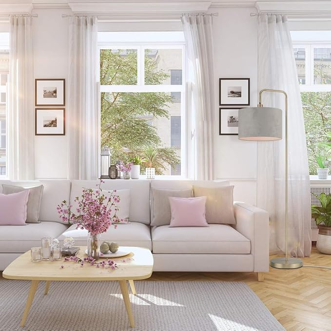 - GLAM MINIMALIST STYLE: the geometric bridge arm of the Barden Floor Lamp combined with its minimalistic design, brass finish and light gray velvet shade brings the glam minimalist style to life, showcasing simplicity as the ultimate sophistication