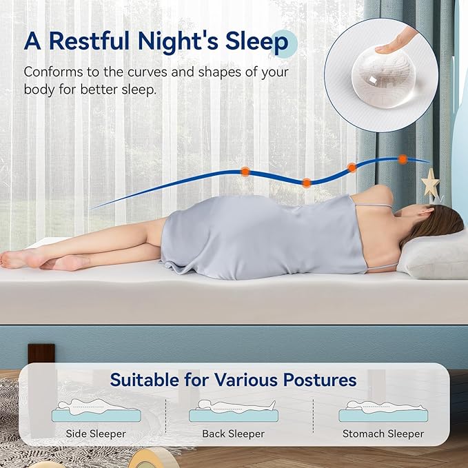 - 💕Plush-Feeling: Our Amazon Basics 6 inch gel memory foam mattress twin size includes 2 inches of gel memory foam and 4 inches of flex comfort support foam for a optimal soft plush feel. This twin bed mattress conforms to different sleep positions and is ideal for side, back and stomach sleepers, providing you with comfortable and cloud-like sleep.