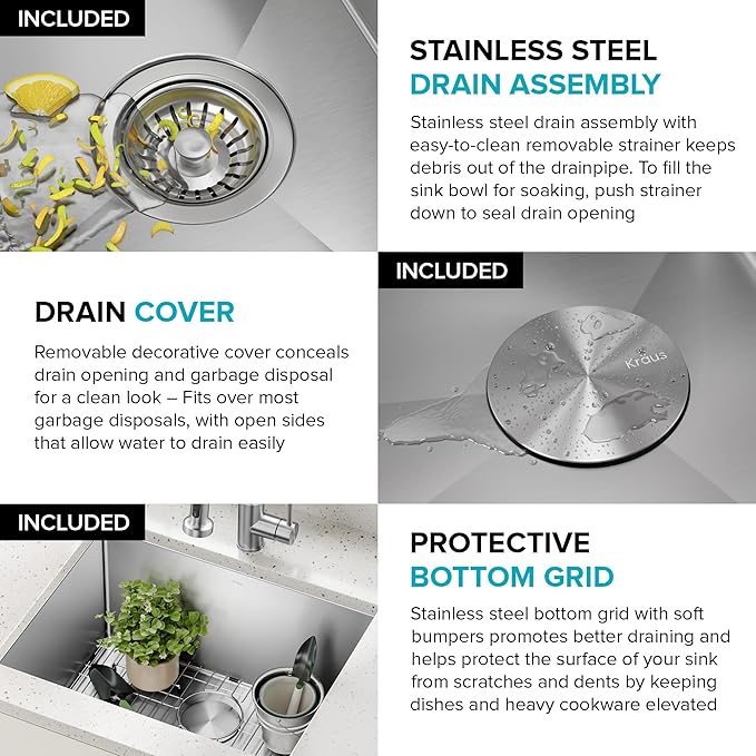 - INCLUDES PROTECTIVE BOTTOM GRID: Stainless steel rinse grid prevents scratches and allows water to drain easily – PREMIUM DRAIN ASSEMBLY with removable strainer traps waste to keep the drainpipe clear – DECORATIVE DRAIN COVER conceals the drain opening to make this utility sink even more stylish