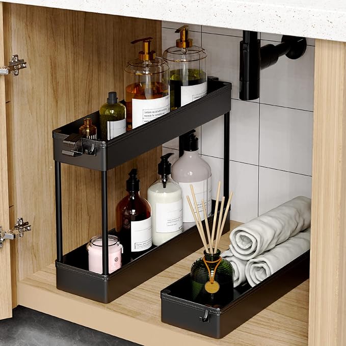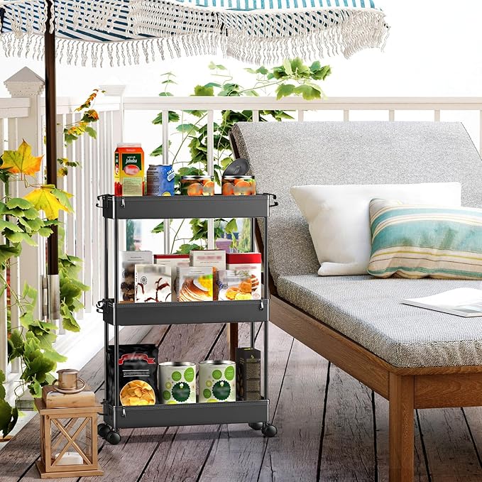 - [Adjustable 3 Layer Storage Cart] This rolling storage cart comes with 4.75 inches slim construction with 3 tier for it to easily fit in narrow spaces in your home. Ideal for bathrooms, kitchen, garage, closet, laundry rooms, offices or in-between your washer and dryer.