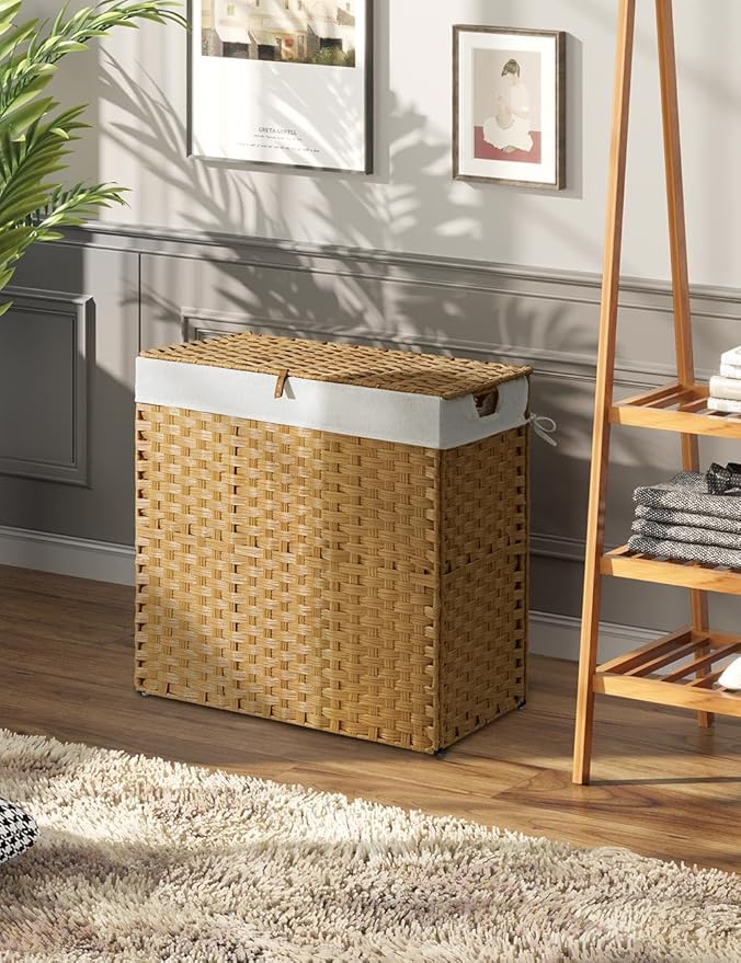 Greenstell Laundry Hamper with lid, No Install Needed, 110L Wicker Laundry Baskets Foldable 2 Removable Liner Bags, 2 Section Clothes Hamper Handwoven Rattan Laundry Basket with Handles, Natural