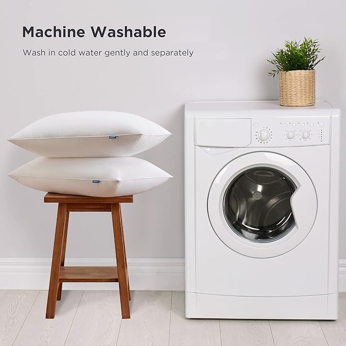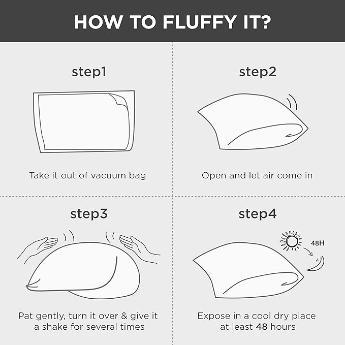 - Warm Tips: Upon unboxing, grab the sides of these pillows and gently shake and pat the pillows to puff up. Allow up to 48 hours for the pillows to regain their max volume. These pillows are machine washable on cold water, and tumble dry low for a like-new restoration