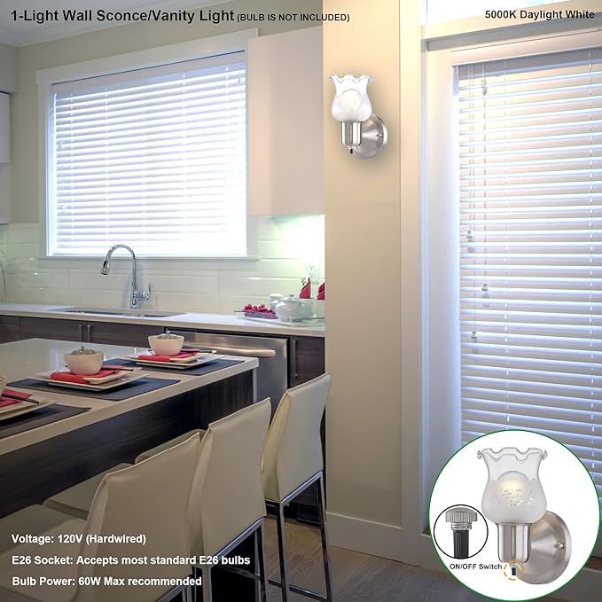 GRUENLICH Wall Sconce, Modern Vanity Light, for Bathroom, Bedroom, Sitting Room, with ON/Off Switch, E26 Base 60W Max, Metal Housing with Glass, Nickel Finish, 1-Pack