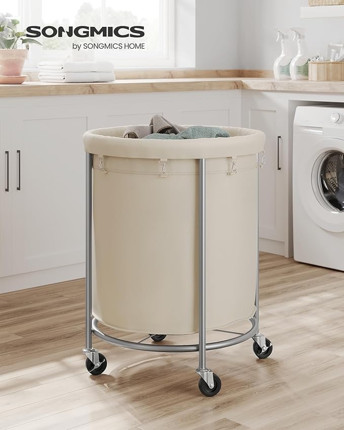 SONGMICS 50.2-Gallon (190 L) Laundry Basket with Wheels, Rolling Round Heavy-Duty Laundry Hamper Cart with Steel Frame and Removable Bag, 2 Locking Wheels, Cream White and Metallic Silver URLS01MZ