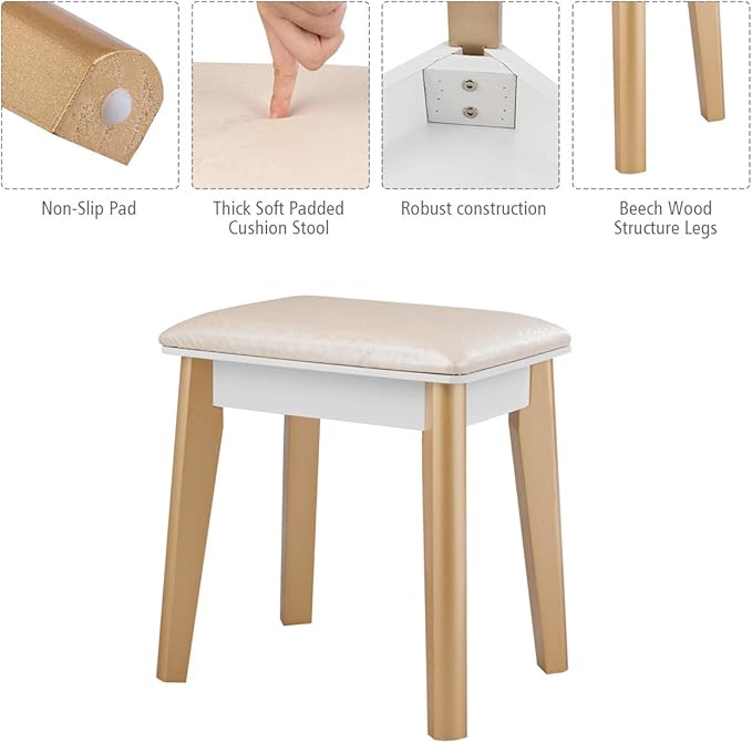 - 【Accompany with Solid Stool】The table top is made of engineered wood, which is smooth and flat. It also comes with an extra soft upholstered stool that allows you to sit comfortably when making up. This vanity set with solid beech legs is more durable than other vanity sets for long time worry-free use.