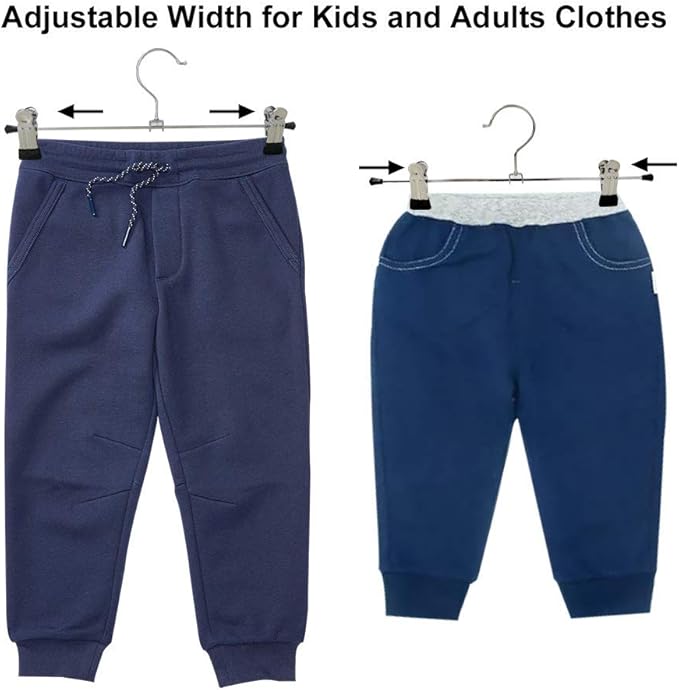 - Adjustable Width - Skirt hangers for pants with 2 adjustable clips that can rotate 360 °, you can move the pants hangers clip to fit different sizes of your pants, short, trousers, jeans, skirt, hat, tie or even kid clothes you want to hang.