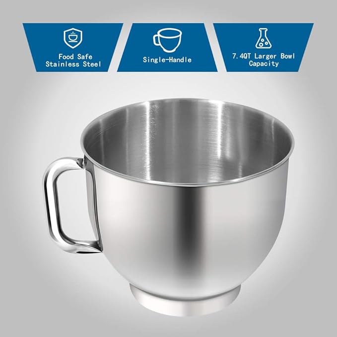 - 【7.4QT LARGE CAPACITY BOWL WITH HANDLE】 7.4QT Shiny stainless steel(#304) bowl can meet all your kitchen needs. The Food Mixer is easy to use for making cakes, breads, cookies, pastry, muffins and waffle, and the single handle is more convenient to hold.
