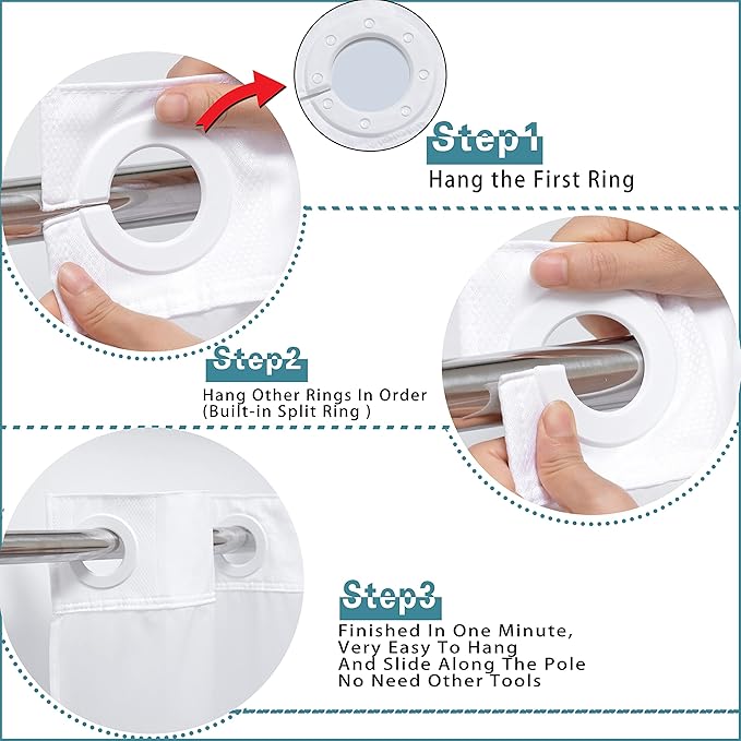 - SUPER EASY TO INSTALL : This shower curtain design with High Quality Flex On Rings that you can very easy to install it in one minute, smart design will made it easier to hang and slide along the pole.