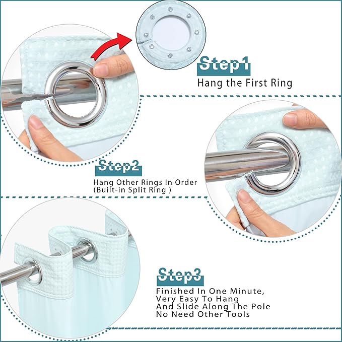 - SUPER EASY TO INSTALL : This shower curtain design with High Quality Flex On Rings that you can very easy to install it in one minute, smart design will made it easier to hang and slide along the pole.