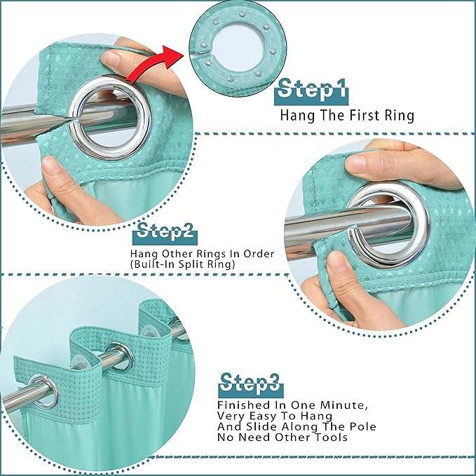 - SUPER EASY TO INSTALL : This shower curtain design with High Quality Flex On Rings that you can very easy to install it in one minute, smart design will made it easier to hang and slide along the pole.