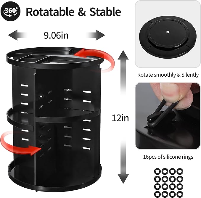 - 360° ROTATING ORGANIZER & LARGE CAPACITY- It takes up very little space of your countertop while still being able to store a lot of your cosmetics. It can hold at least 30 makeup brushes, 20 skincare products and other accessories including lipsticks, nail polish, eyeliner and more cosmetics.