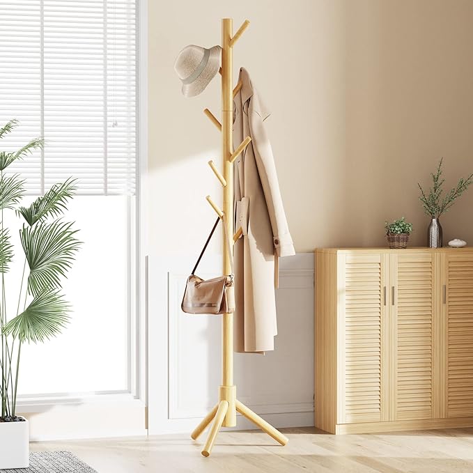 Pipishell Coat Rack Sturdy Wooden Coat Rack Stand, Adjustable Coat Tree, Free Standing Tree Hanger with 4 Sections & 8 Hooks, for Home/Bedroom/Office/Hallway/Entryway