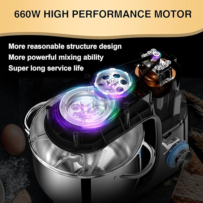 - 🍕【660W MOTOR & 6 SPEEDS PLUS PULSE FUNCTION】The KUCCU Electric Mixer is equipped with a 660W pure copper motor to better ensure that it works more perfectly. Precise 6 speed controller lets you choose from a slow stir to a fast mix. The powerful performance of planetary mixing action for mixing bread dough, thick batters, meringues, and whipping creamplus lower speeds for stirring and finessing your most delicate concoctions. Pulse function can reach the highest speed in a second.