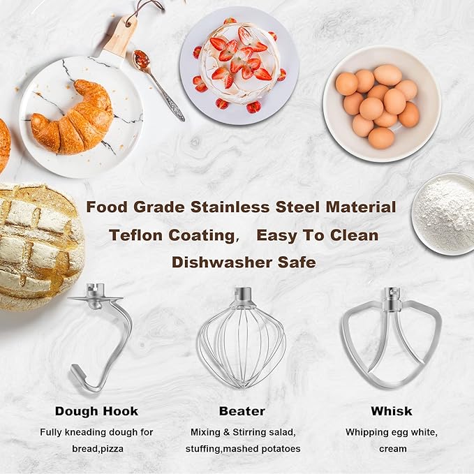 - 9-in-1 KITCHEN MACHINE - Vospeed kitchen stand mixer is a multi-functional food processor. It is equipped with a dough hook, whisk, beater, juice blender, meat grinder! It’s a perfect kitchen helper for making cakes, bread, cookies, smoothies, juicer,salad, sausage, meat sauce etc. The splash guard helps to add ingredients without making a mess