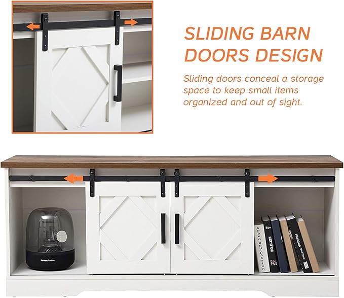 - 【Farmhouse Barndoor Design】WAMPAT TV stands crafted from finest wood grain surface and featured barn doors that slide easily, allowing easy access to all necessities. Suitable for all the decor style and increase aesthetic for your living room.