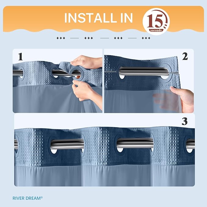 River Dream Blue Shower Curtain No Hooks Required Dotted Waffle Weave Shower Curtain with Snap in Liner - 71W x 74H,Hotel Grade,Spa Like Bath Curtain,Moonlight Blue