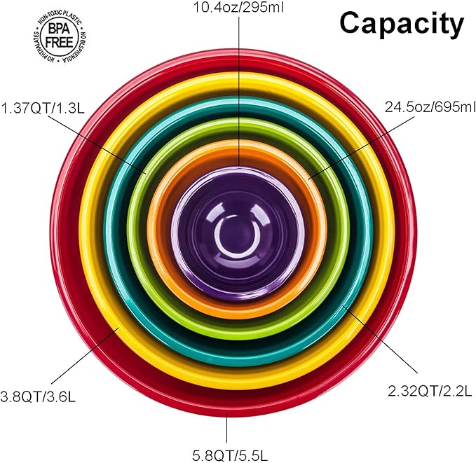 - 12 Piece nesting bowl set - included 6pcs prep bowls(10.4oz, 24.5oz, 1.37QT, 2.4QT, 3.69QT and 5.8QT) and 6pcs plastic lids.