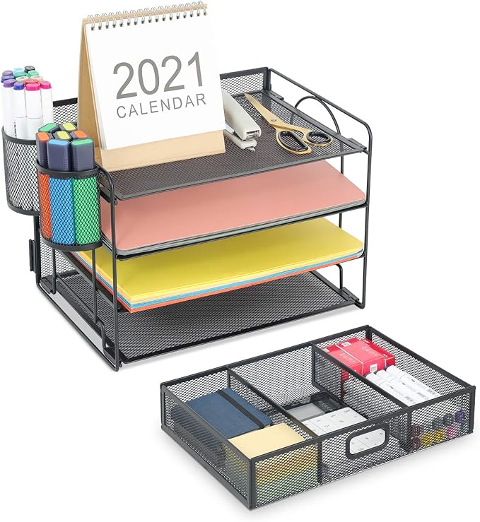 - 【Perfect Desktop File Organizer】Our Office Desk Supplies Organizer is made of 4 sliding trays + 2 Hanging Pencil Holders + 1 sliding drawer which has enough storage space to accommodate all office supplies, such as pens, pencils scissors, folders and Letter/A4 Size Paper
