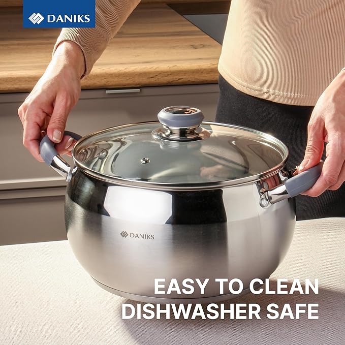 Daniks Modern Stainless Steel Stock Pot with Glass Lid – Induction 4 Quart, Dishwasher Safe, Heatproof Handles, For Soup, Pasta, Stew, Silver