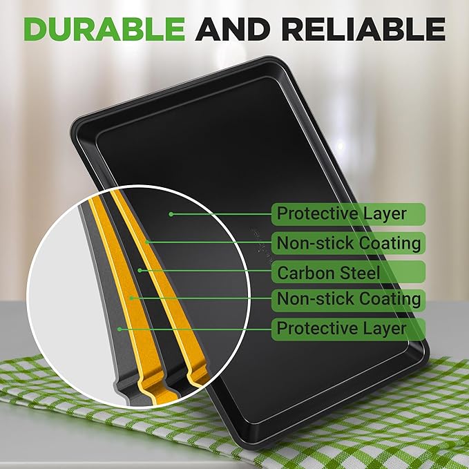 - RIMMED BORDER: These cookie sheets nonstick baking sheet set features fully rimmed border that prevents parchment paper from sliding out and juices/sauces from spilling while providing ample airflow and heat distribution for even baking/cooking