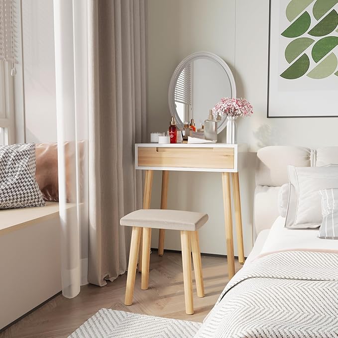 - STURDY & DURABLE FRAME: Solid wood material table with wood legs is more durable.Table comes with a soft cushioned stool . Soft beige cushion allows you to sit comfortably when makeup. Wood legs give sufficient stability and great load-bearing capacity. They are very durable and ideal for long-term use