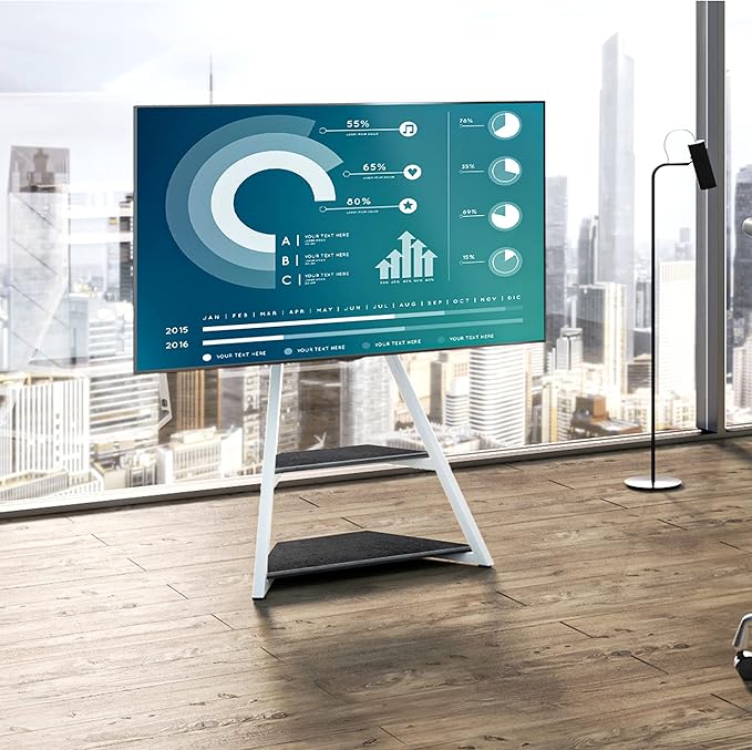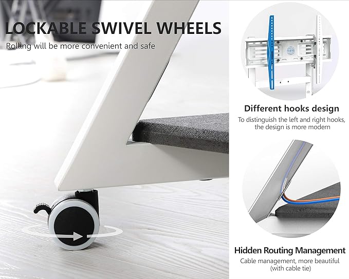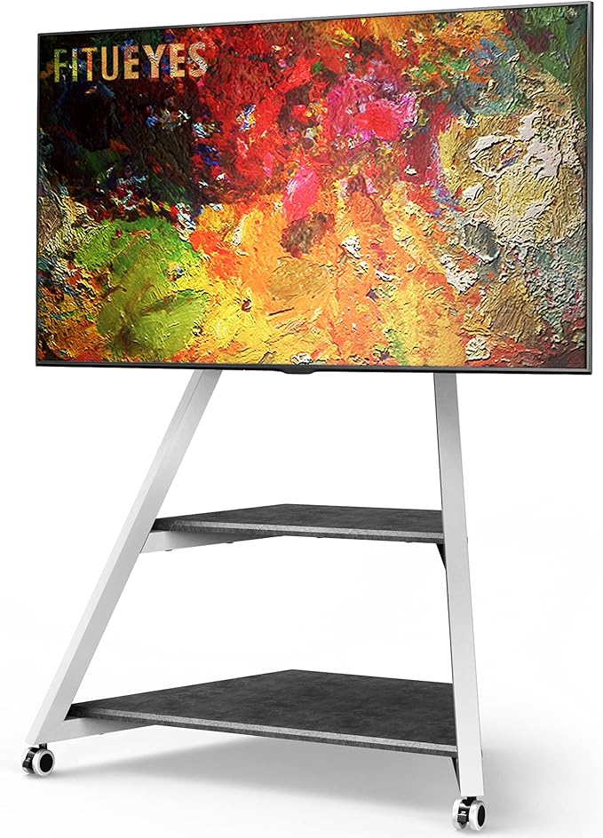 - Mobile TV stand with flexibility: You can move this rolling TV stand easily to your bedroom, living room, dining room, kitchen, kids, nursery, home office. The wheels of this floor TV stand are made of tough material with good silence, wear resistance, and smoothness. All the 4 wheels are also equipped with brakes, so you can fix it in different positions as needed