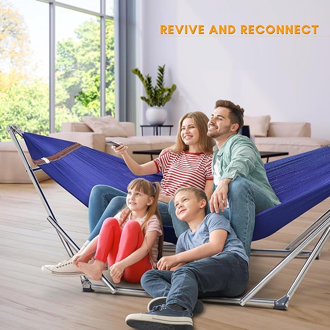 Tranquillo Double Hammock with Stand 650lb Capacity Double Hammock with Spreader Bar, Solid Grade 201 Stainless Steel 30s Set Up, Sturdy Flexible Hammock Stand Portable (Blue)