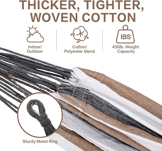 - ULTIMATE COMFORTABLE , The thicker and tighter woven cotton hammock spreads your weight in the center, while the fabric on both sides softly wraps you, and enjoys gravity-free relaxation