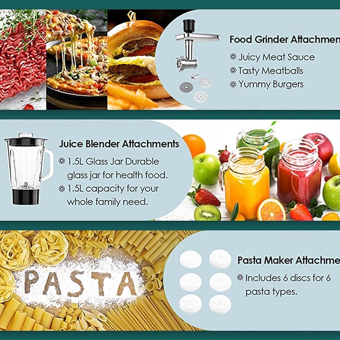 - MULTIPURPOSE ATTACHMENT HUB---By adding accessories such as pasta machine, juicer, food grinder, biscuit press, vegetable slicer and other accessories, you can diversify your cooking and baking skills and become an exquisite baker. Each individually included in the package with our food mixer