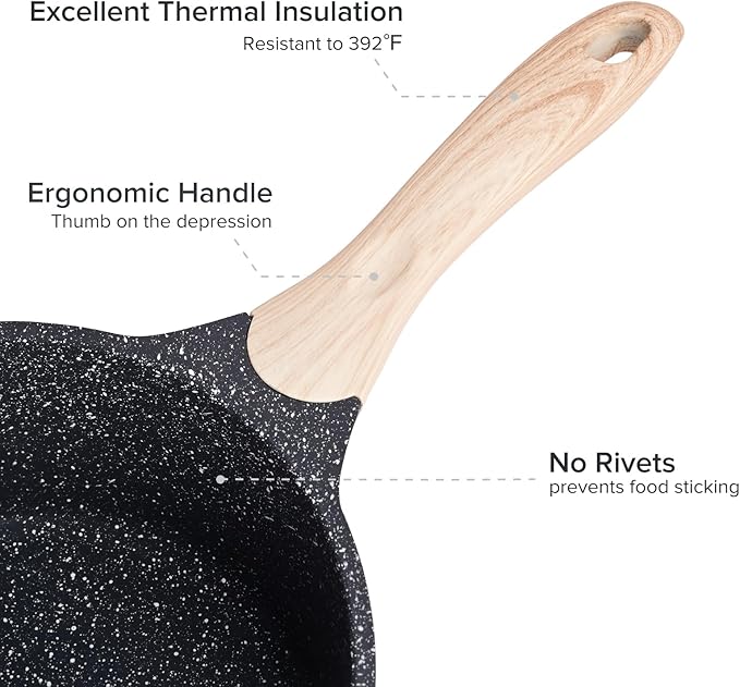- [Heat-Insulating Handle] - More ergonomic wood grain Bakelite handle for a comfortable grip. Good heat resistance allows it to stay cool while cooking. The safe temperature for nonstick pot is 302℉ (long time high temperature will shorten the life of the handle)