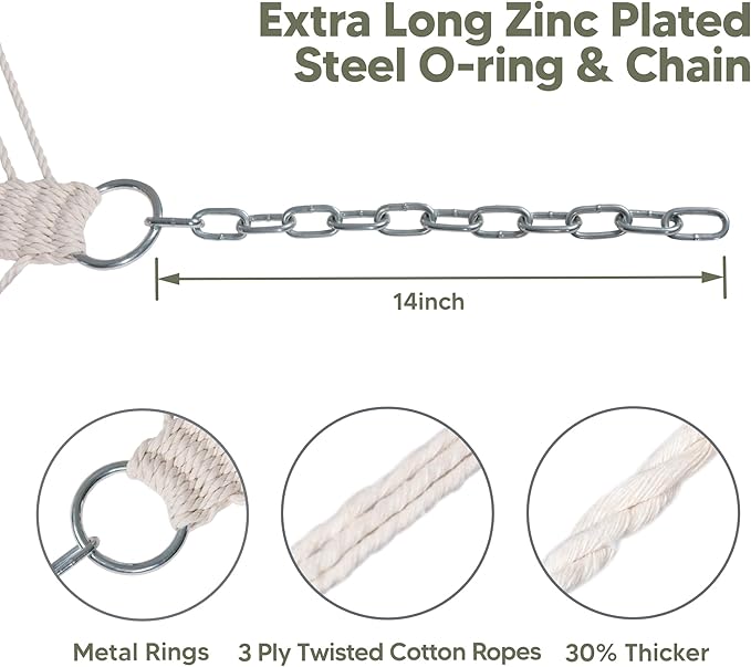 - Upgraded 30% Thicker Ropes: The upgraded strong poly-cotton ropes are hand-woven with comfortable, long-lasting threads woven by the hammock artisans, 30% thicker than before. The 20 ropes are collected together and woven into a triangle pattern which is pleasing to the eye. O-shaped steel ring attaches the ropes and the chain