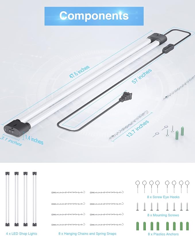 - đź’ˇ WIDE APPLICATION - Ideal for a variety of settings including garages, workshops, basements, and utility rooms, this versatile LED shop light meets all your lighting needs with exceptional performance and efficiency.