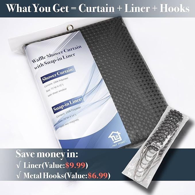 - Smart Design Set & Hotel Style: Dark grey waffle weave shower curtain with the white detachable liner, and free 12 rust resistant hooks, the entire 3-in1 set offers a complete solution for bathtub or stall