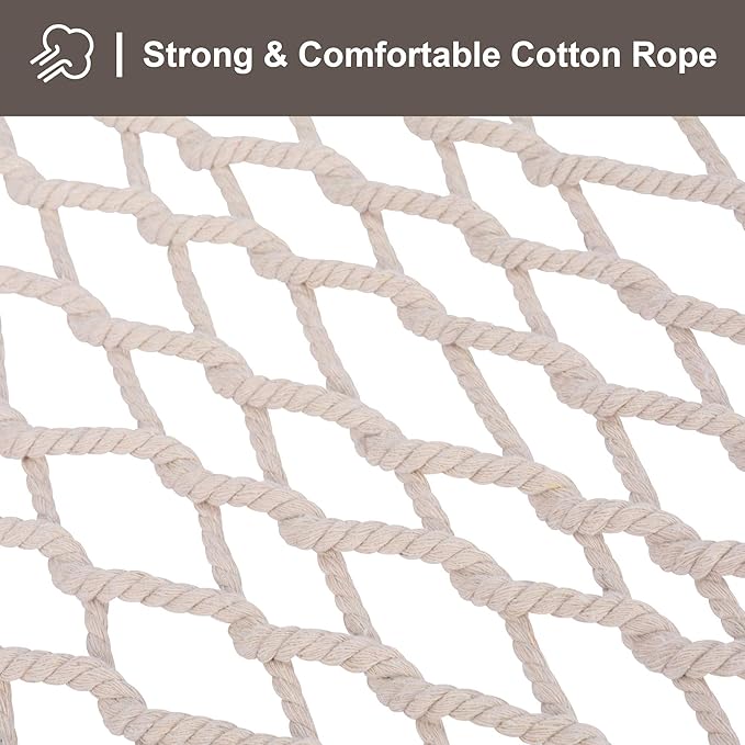 - Upgraded 30% Thicker Ropes: The upgraded strong poly-cotton ropes are hand-woven with comfortable, long-lasting threads woven by the hammock artisans, 30% thicker than before. When you lay on the rope hammock, it helps you relieve stress and provide better blood circulation throughout the body. And thanks to the well ventilated mesh, your back won’t be sweaty anymore