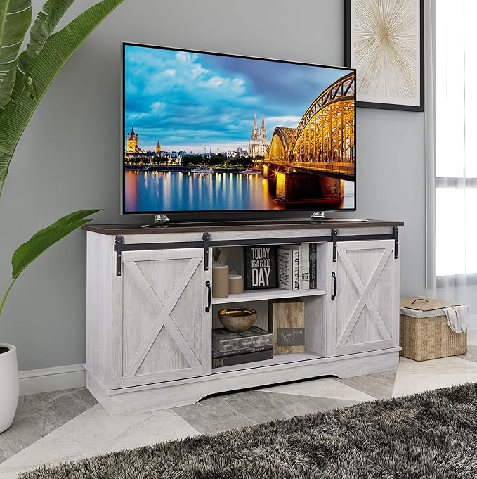 - 【Classical Design】Farmhouse accent X-frame design. Abundant storage in cabinets with adjustable shelves, cord management ports and sliding barn doors for easy access. Open shelves for displaying décor items.