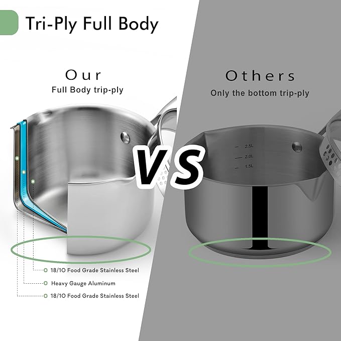 - Ideal Choice: The stainless saucepan with cover constructed Tri--ply stainless steel for whole body with multi-clad construction avoids heat spots and distributes safe heat evenly. Oven-safe to 550°F (glass lid is oven safe to 400℉). Dishwasher-safe for quick cleanup.
