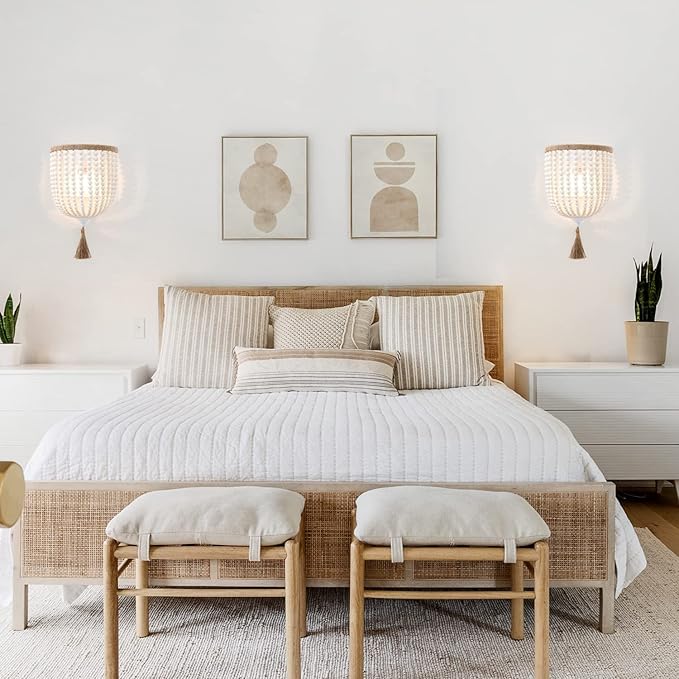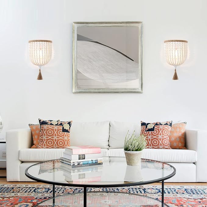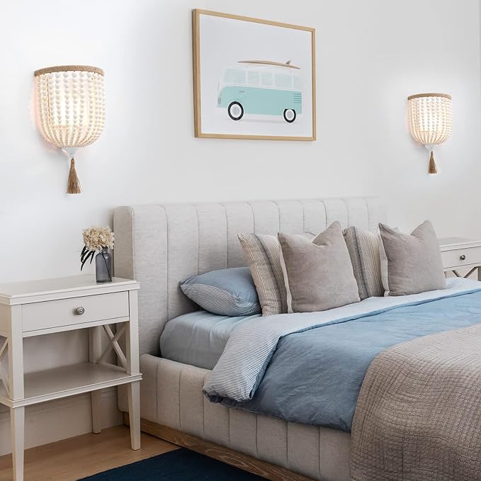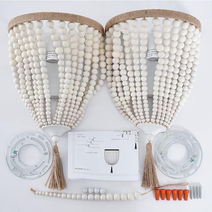 - Design: These wall sconces decorated classic bohemia style elements made up of solid white wood bead and hand rope knot, creating an eye-catching look that lends bohemian flair to any area.