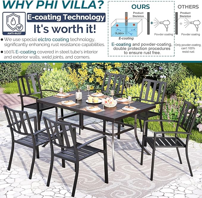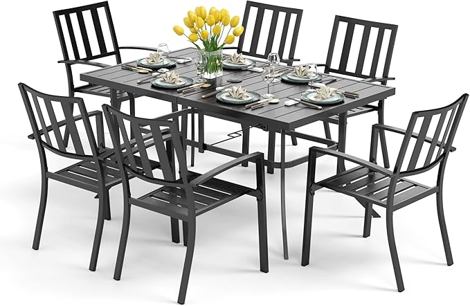 PHI VILLA 7 Piece Outdoor Dining Set for 6, 60” Rectangular Metal Dining Table with Umbrella Hole & 6 Steel Chairs for Patio, Deck, Yard
