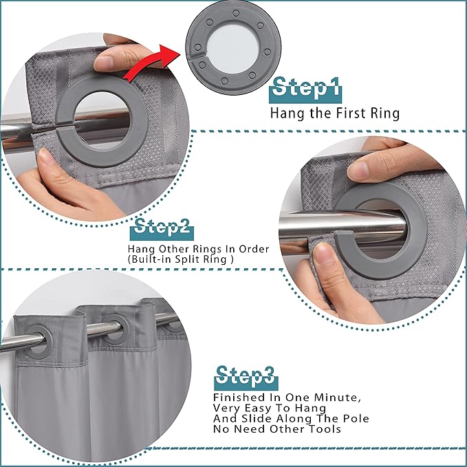 - SUPER EASY TO INSTALL : This shower curtain design with High Quality Flex On Rings that you can very easy to install it in one minute, smart design will made it easier to hang and slide along the pole.