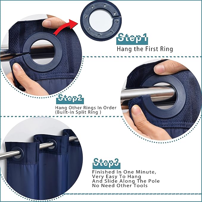 - SUPER EASY TO INSTALL : This shower curtain design with High Quality Flex On Rings that you can very easy to install it in one minute, smart design will made it easier to hang and slide along the pole.