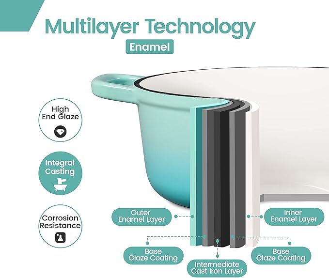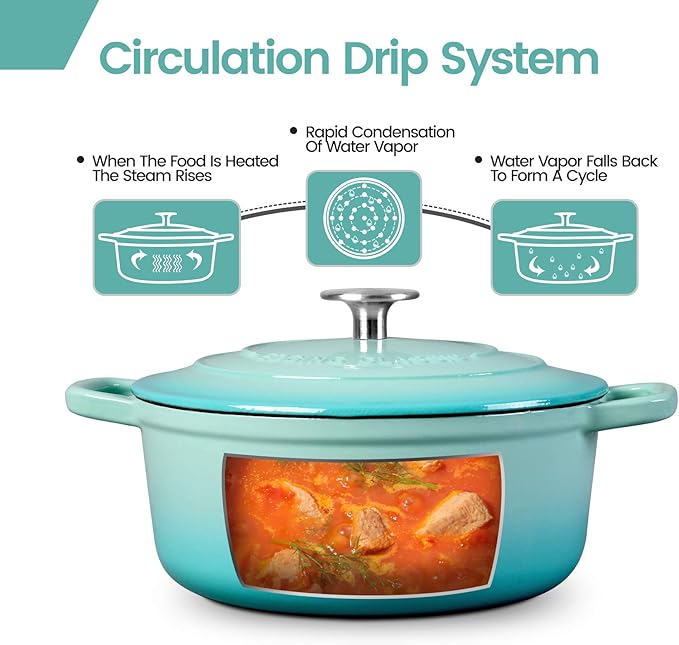 - Suitable for 6-7 people: The 5.5 quart enamel Dutch oven is the choice for cooking food and desserts. Its design makes your food look more delicious
