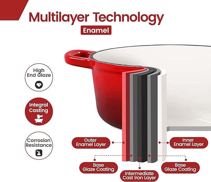 - Suitable for 6-7 people: The 5.5 quart enamel Dutch oven is the choice for cooking food and desserts. Its design makes your food look more delicious